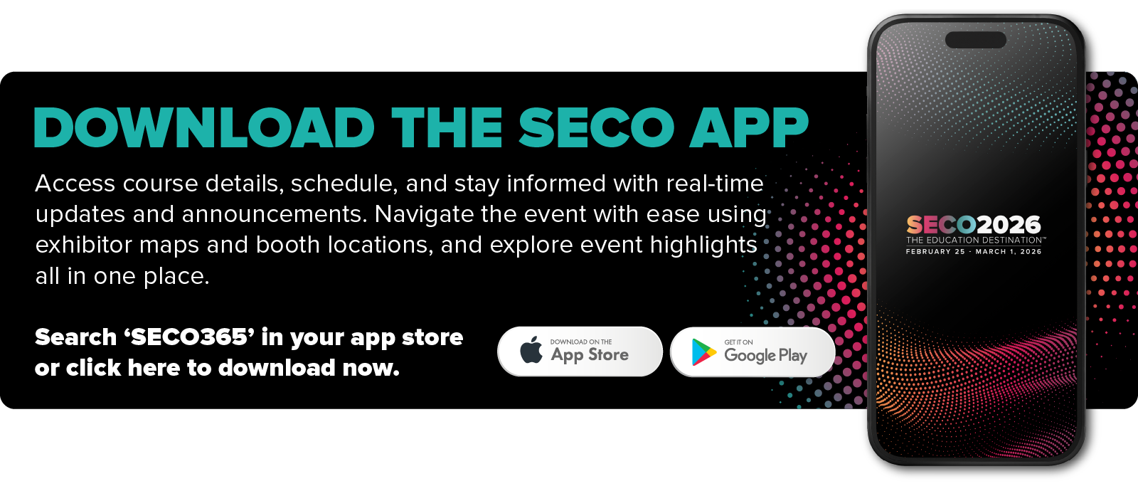 COURSE HANDOUTSDon't forget to download the course handouts and SECO 2026 mobile app available on both iOS and Android to have the meeting at your fingertips! Search for "SECO365". |